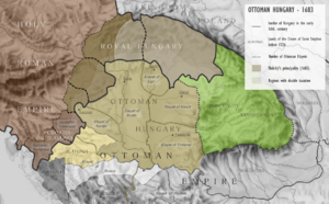 The Magyars conquered the area at the end of the 9th century and firmly established their control over it in 1003, when their king ستفان الأول, according to legend, defeated the native prince entitled or named Gyula.[3][4][5][6] بين عامي 1003 و 1526، كانت ترانسلڤانيا ڤويڤودية في مملكة المجر، بقيادة ڤويڤود يعينه الملك المجري. بعد معركة موهاكس في 1526 أصبحت ترانسلڤانيا فعلياً إمارة مستقلة بحكمها بشكل رئيسي أمراء مجريون كالڤنيون. وبعد ذلك، في 1566، تم تقاسم المجر بين الهابسبورگ والأتراك، مع احتفاظ الإمارة الترانسلڤانية باستقلال ذاتي ككيان خاضع للدولة العثمانية.
