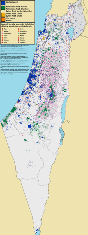 خريطة لمواقع الفلسطينية التي أُخليت من سكانها، متراكبة على الخريطة الديموغرافية والسياسية اليوم.
