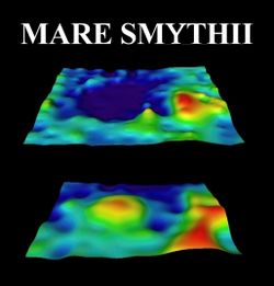 اشارات الطبوغرافيا (أعلى) والجاذبية المناظرة (أسفل) للبحر القمري Mare Smythii تحتوي على قدر عالٍ من التركيز الشامل.