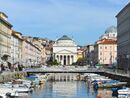 A collage of Trieste showing the Piazza Unità d'Italia, the Canal Grande (Grand Canal), the Serbian Orthodox church, a narrow street of the Old City, the Castello Miramare, and the city seafront seen from the Molo Audace | |