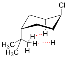 One consequence of this analysis is that trans-4-tert-butylcyclohexyl chloride cannot easily eliminate but instead undergoes substitution (see diagram below) because the most stable conformation has the bulky t-Bu group in the equatorial position, therefore the chloride group is not antiperiplanar with any vicinal hydrogen (it is gauche to all four). The thermodynamically unfavored conformation has the t-Bu group in the axial position, which is higher in energy by more than 5 kcal/mol (see A value).[18] As a result, the t-Bu group "locks" the ring in the conformation where it is in the equatorial position and substitution reaction is observed. On the other hand, cis-4-tert-butylcyclohexyl chloride undergoes elimination because antiperiplanarity of Cl and H can be achieved when the t-Bu group is in the favorable equatorial position.