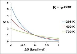 Three isotherms are given in the diagram depicting the equilibrium distribution of two conformers at different temperatures. At a free energy difference of 0 kcal/mol, this gives an equilibrium constant of 1, meaning that two conformers exist in a 1:1 ratio. The two have equal free energy; neither is more stable, so neither predominates compared to the other. A negative difference in free energy means that a conformer interconverts to a thermodynamically more stable conformation, thus the equilibrium constant will always be greater than 1. For example, the ΔG° for the transformation of butane from the gauche conformer to the anti conformer is −0.47 kcal/mol at 298 K.[5] This gives an equilibrium constant is about 2.2 in favor of the anti conformer, or a 31:69 mixture of gauche:anti conformers at equilibrium. Conversely, a positive difference in free energy means the conformer already is the more stable one, so the interconversion is an unfavorable equilibrium (K < 1).