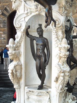 Perseus with the Head of Medusa in the Loggia dei Lanzi gallery on the edge of the Piazza della Signoria in Florence; picture taken after the statue's cleaning and restoration.