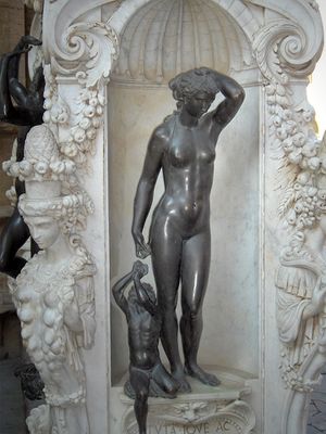 Modern replica of the statue of Danaë in the pedestal of Perseus; Loggia dei Lanzi, Florence, Italy. The original is on display at the Museo del Bargello in Florence.
