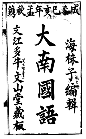 Among the earlier works in Nôm of this era are the writings of Nguyễn Trãi (1380–1442).[45] The corpus of Nôm writings grew over time as did more scholarly compilations of the script itself. Trịnh Thị Ngọc Trúc , consort of King Lê Thần Tông, is generally given credit for Chỉ nam ngọc âm giải nghĩa (指南玉音解義; 'guide to Southern Jade sounds: explanations and meanings'), a 24,000-character bilingual Hán-to-Nôm dictionary compiled between the 15th and 18th centuries, most likely in 1641 or 1761.[46][47]