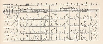 - الارتجال، حيث يزود مصمم الرقص الراقصين "بنوتة" (أي توجيهات عامة) تعمل كإرشادات للحركة والشكل المرتجلين. على سبيل المثال، قد توجّه النوتة الراقص للانسحاب من راقص آخر، والذي يُطلب منه بدوره تجنب الانسحاب، أو قد تحدد تسلسلاً من الحركات التي يجب تنفيذها بطريقة مرتجلة على مدار جملة موسيقية، كما في تصميم رقصة الكونترا. تقدم النوتات المرتجلة عادةً مجالاً واسعاً لأن يفسرها الراقص بشكل شخصي.