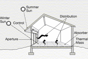 في تصميم المباني الشمسية السلبية passive solar building design، النوافذ، الجدران، والأرضيات تكون مضنوعة لتجمع، تخزن، وتوزع الطاقة الشمسية في صورة حرارة في الشتاء وتعكس حرارة الشمس في الصيف. يطلق على هذا التصميم الشمسي السلبي أو التصميم المناخي، لأنه، على عكس أنظمة التسخين الشمسي النشطة، لا يدخل في استخدام الأجهزة الميكانيكية والكهربائية.[1]