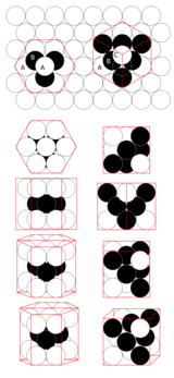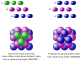 Two simple arrangements within the close-packed family correspond to regular lattices. One is called cubic close packing (or face-centred cubic, "FCC")—where the layers are alternated in the ABCABC... sequence. The other is called hexagonal close packing ("HCP"), where the layers are alternated in the ABAB... sequence.FCC and HCP are not both lattices?[محل شك] But many layer stacking sequences are possible (ABAC, ABCBA, ABCBAC, etc.), and still generate a close-packed structure. In all of these arrangements each sphere touches 12 neighboring spheres,[2] and the average density is