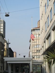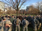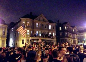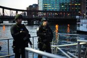 A 20-block area of Watertown was cordoned off and residents were told not to leave their homes or answer the door, as officers scoured the area in tactical gear. Helicopters circled the area and SWAT teams in armored vehicles moved through in formation, with officers going door to door and searching houses.[112] These actions generated discussions about the legality of searching large numbers of houses without a search warrant, with The Atlantic stating that this kind of search is legal due to exigent circumstances.[113] Agencies on the scene were the FBI; the Bureau of Alcohol, Tobacco, Firearms, and Explosives; Diplomatic Security Service; HSI-ICE; the National Guard; the Boston, Cambridge, and Watertown Police departments; and the Massachusetts State Police. The show of force was the first major field test of the interagency task forces created in the wake of the September 11 attacks.[114]