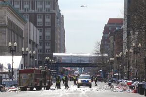 Dropped bags and packages, abandoned as their owners fled from the blasts, increased uncertainty as to the possible presence of more bombs[24][37] and many false reports were received.[7][27][38] Simultaneously an electrical fire at the John F. Kennedy Presidential Library in nearby Dorchester was initially feared to be a bomb.[39]