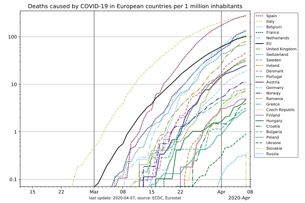 ![]() الأعداد التراكمية للوفيات لكل مليون نسمة جراء الإصابة بكوڤيد-19 في أوروپا.[1] | |
