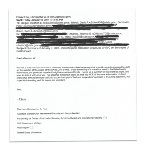 من جانبه ، اعتقد فريق وزارة الخارجية أن فورد هو من يحاول فرض استنتاج مسبق: أن COVID-19 له أصل طبيعي. بعد أسبوع ، حضر أحدهم الاجتماع حيث نصح كريستوفر بارك ، الذي عمل تحت قيادة فورد ، الحاضرين بعدم لفت الانتباه إلى تمويل الولايات المتحدة لأبحاث اكتساب الوظيفة.