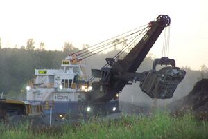 Excavation was done with shovels until the late 19th century when steam shovels came into use. It was reported that a laborer on the western division of the Erie Canal was expected to dig 5 cubic yards per day in 1860; however, by 1890 only 3-1/2 yards per day were expected.[16] Today's large electric shovels have buckets that can hold 168 cubic meters (220 cubic yards) and consume the power of a city of 100,000.[17]