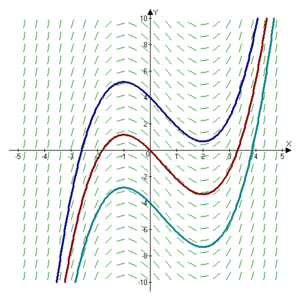 ![]() حقل الميل للدالة ƒ(x) = (x3/3)-(x2/2)-x+c يُظهر ثلاث من عدد لا نهائي من الحلول التي يمكن التوصل إليها باستخدام الثابت العشوائي c. |
