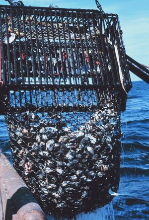 Fishing dredges are used to collect various species of clams, scallops, oysters or mussels from the seabed. Some dredges are also designed to catch crabs, sea urchins, sea cucumbers, and conch. These dredges have the form of a scoop made of chain mesh, and are towed by a fishing boat. Clam-specific dredges can utilize hydraulic injection to target deeper into the sand.[24] Dredging can be destructive to the seabed and some scallop dredging has been replaced by collecting via scuba diving.[25]