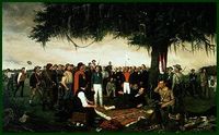 The painting "Surrender of Santa Anna" by William Henry Huddle shows the Mexican general Santa Anna surrendering to a wounded Sam Houston.