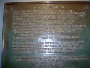 في عام 1903 تم وضع لوحة تذكارية من البرونز علي حائط قاعدة البرج الداخلية مكتوبا عليها كلمات الشاعره الأمريكية إيما لازاروس بعد 20 عاما من كتابتها في 1883.