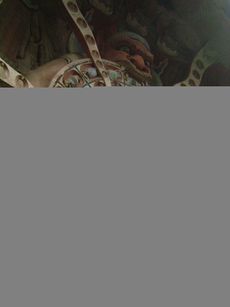 In this 8-meter (25-foot) tall Buddhist relief, made sometime between the years 1177 and 1249, Mara, Lord of Death and Desire, clutches a Wheel of Reincarnation which outlines the Buddhist cycle of reincarnation.