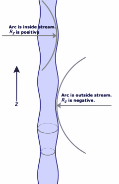 Intermediate stage of a jet breaking into drops. Radii of curvature in the axial direction are shown. Equation for the radius of the stream is , where is the radius of the unperturbed stream, is the amplitude of the perturbation, is distance along the axis of the stream, and is the wave number