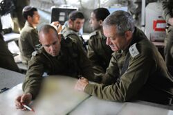 رئيس أركان الجيش الإسرائيلي بني گانتس (يمين) في تدريب حيث تمارس القوات سيناريو اختطاف جندي. في كلمته أمام منتدى عمليات الجيش الإسرائيلي، قال گانتس إن بروتوكولات الجيش الإسرائيلي لا تسمح بقتل جندي من أجل منع اختطافه.[1]