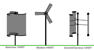 يمكن لتوربينات الرياح الدوران حول إما محور أفقي أو محور رأسي، إلا أن الأول هو الأكثر شيوعاً.[35] وقد تتضمن أيضاً شفرات أو تكون بدون شفرات.[36] تنتج التصميمات الرأسية ذات الحجم المنزلي طاقة أقل وهي أقل شيوعاً.[37]