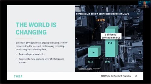 تم إطلاق توكا بخطط "لتوفير أدوات تجسس لأي جهاز يحتاجه عملاؤها"، بما في ذلك ليس فقط الهواتف الذكية ولكن "التركيز بشكل خاص على ما يسمى بـ إنترنت الأشياء (IoT)." وفقاً للشركة، يشمل ذلك أجهزة مثل أمازون إيكو ومنتجات جوجل نست المنزلية المتصلة، بالإضافة إلى الثلاجات وأجهزة الترموستات وأجهزة الإنذار المتصلة. قالت الشركة في ذلك الوقت إن عمليات الاستغلال في هذه المنتجات التي اكتشفتها شركة توكا، لن يتم الكشف عنها للبائعين، مما يعني أن هذه العيوب ستظل عرضة لأي متسلل\مقرصن، سواء كان عميلاً لـ توكا أم لا.