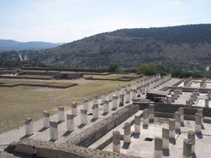 View of the columns of the burned palace at Tula Hidalgo. The second ballcourt is in the background.