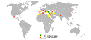 وقد نقل إلى أوروبا عن طريق الفينيقيين والإغريق ، وعندما جاءت الفتوحات العربية انتقل التين إلى معظم البلدان التي وصل إليها العرب، وانتقل إلى الشرق عن طريق سوريا ووصل إلى الهند في القرن الرابع عشر الميلادي وانتشر في الصين حوالي القرن السادس عشر ودلت الكثير من الآثار التي تعود إلى 2000 عام قبل الميلاد بأن زراعة التين كانت من الزراعات الرئيسية في بلدان آسيا الصغرى وكانت عمليات التجفيف والتصدير لثماره من التجارات الهامة في ذلك الوقت يزرع التين في الوقت الحاضر بكثرة في بلدان البحر الأبيض المتوسط وفي أمريكا الشمالية والوسطى والجنوبية وفي بلدان أواسط آسيا وتنتشر شمالاً حتى شواطئ البحر الأسود وبحر قزوين. [1]
