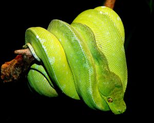 The green tree python (Morelia viridis), is a species of snake in the family Pythonidae. The species is native to New Guinea, some islands in Indonesia, and the Cape York Peninsula in Australia. First described by Hermann Schlegel in 1872, it was known for many years as Chondropython viridis. As its common name suggests, it is a bright green snake that can reach a total length (including tail) of 2 m (6.6 ft) and a weight of 1.6 kg (3.5 lb), with females slightly larger and heavier than males. Living generally in trees, the green tree python mainly hunts and eats small reptiles and mammals. It is a popular pet, and numbers in the wild have suffered with large-scale smuggling of wild-caught green tree pythons in Indonesia. Despite this, the green tree python is rated as least concern on the IUCN Red List of endangered species.
