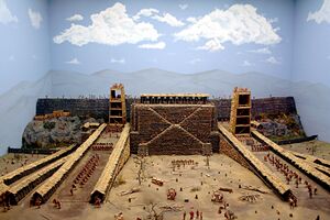 Many oppida had planned layouts and some had standardised building designs, indicating a high level of central organization.[34][35] At the oppidum of Manching in Germany all the buildings were constructed with the same standardised measurements, and a metal measuring rod conforming to this standard was found within the settlement.[36][37] Similar standards have been identified at multiple other oppida.[38] The layout and structure of oppidum buildings demonstrates a knowledge of geometric principles that suggests the role of specialized craftsmen, surveyors or master builders in their construction.[38] Large buildings inside the oppida included temples, assembly spaces and other public buildings.[39][40] At the oppidum of Bibracte a monumental stone basin was constructed in the centre of the oppidum based on a precise geometric design with an astronomical alignment.[41][42][43][44]