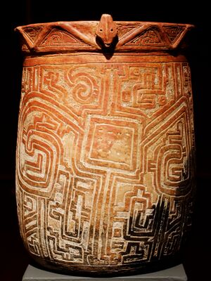 Travelers in the 1800s noted both the presence of mounds and the beauty of the ceramics found inside them or exposed on their sides.[9] Museums in Europe and the United States began to collect some of the larger and more beautiful pieces, the largest of which are funerary urns. Buried in house floors constructed on the tops of the mounds, the elaborately decorated urns contain the remains of significant individuals. When the individuals died, the flesh was cleared from their bones and the remains were placed in the urns, which were then topped with a bowl or platter.[10]