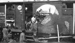 The Legion and the Bolsheviks distrusted each other.[10][7] Leaders of the Legion suspected the Bolsheviks of seeking favor with the Central Powers, while the Bolsheviks viewed the Legion as a threat, a potential tool for anti-Bolshevik intervention by the Allies,[11] while simultaneously seeking to use the Legion to manifest just enough support for the Allies to prevent them from intervening on the pretext that the Bolsheviks were too pro-German. At the same time, the Bolsheviks, in desperate need of professional troops, tried to convince the Legion to incorporate itself to the Red Army.[12] The slow evacuation by Trans-Siberian Railway was exacerbated by transportation shortages: as agreed in the Treaty of Brest-Litovsk, the Bolsheviks prioritized the westbound repatriation of German, Austrian, and Hungarian POWs.