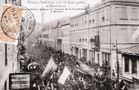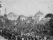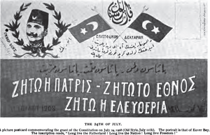 اعلان تركيا الفتاة مطالب الثورة المتمثلة في الاصلاحات الدستورية المسماة مشروطية، في حضور مختلف ملل الدولة العثمانية. ملا تركي (في المنتصف) يجلس على مائدة التصويت وعلى يمينه قس يوناني وعلى يساره قس أرمني. وفي الخلف تقف طفلتان تحملان درع الدستور مزيناً بالزهور؛ وفي المقدمة صندوق اقتراع. الوقوف هم زعماء أتراك ويونانيون وأرمن. الحائط في الخلفية هو واجهة كنيسة يونانية. | |||||||