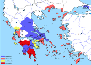 خريطة اليونان أثناء عز القوة الطيبية في 362 ق.م.، تبين كتل القوى الطيبية والاسبرطية والأثينية والكورنثية