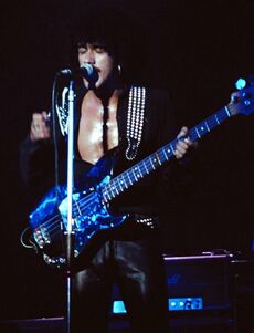 In August the band began another tour of the US, followed by a trip to Australia and New Zealand. Brian Downey did not accompany them, having contracted pneumonia and preferring to spend some time in Ireland. He was replaced for the tour by American drummer Mark Nauseef.[73] On their return, Downey rejoined the band and at the beginning of 1979 they recorded Black Rose: A Rock Legend in Paris. The sessions were marked by the increasing drug habits of Lynott and Gorham, and the general presence of drugs around the band.[74] This also showed in the subject matter on the album, in songs such as "Got to Give It Up". Celtic influences remained, however, particularly in the album closer "Róisín Dubh", a seven-minute medley of traditional Irish songs given a twin guitar rock veneer. Two singles, "Waiting for an Alibi" and "Do Anything You Want To", were successful, and the album reached No. 2 in the UK.[75] A third, moderately successful single, "Sarah" was Lynott's ode to his new-born daughter.[76]