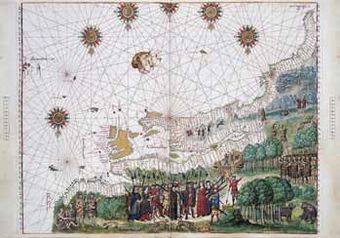 حط كارتييه الرحال في كندا في عام 1534م. وتوضح هذه الخريطة التي تعود للأربعينيات من القرن السادس عشر كارتييه في الوسط وهو يرتدي قبعة حمراء وسترة قصيرة سوداء، ويحيط به أعضاء بعثته. اكتشف كارتييه خليج سان لورنس وألحق المنطقة بملكية فرنسا.
