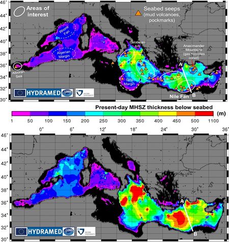 ![]() مصدر الخريطتين: بحث مقدم في مؤتمر مخصص لهيدرات الميثان.[3] |