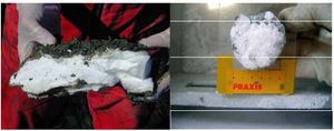 ![]() عينات من ترسبات بحرية تحتوي هيدرات. يسار: بدون تكسير، يمين: في جبال أناكسيماندر بالبحر المتوسط.[2] |