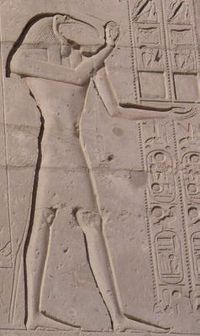 - ^ الكتابة الهيروغليقية تم التأكد منها، ضمن مصادر أخرى، من كتاب (Budge The Gods of the Egyptians Vol. 1 p. 402) and (Collier and Manley p. 161)