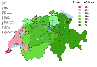 فقط أربعة من 26 كانتون عارضت المبادرة، الأمر الذي منح الاستفتاء الأغلبية المزدوجة التي تجعل الحظر على المآذن جزءاً من الدستور السويسري.[2]