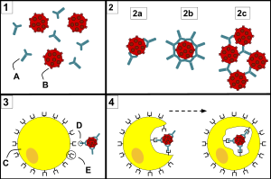 1) الأجسام المضادة (أ) ومسببات الأمراض (ب) تتجول بحرية في الدم. 2) ترتبط الأجسام المضادة بمسببات الأمراض ، ويمكن أن تفعل ذلك في تكوينات مختلفة مثل: الطهاية (2a) ، وتحييد (2b) ، والتلازن(2c). 3) تقترب الخلايا البلعمية (C) من العامل الممرض ، وترتبط بمنطقة Fc (D) للجسم المضاد بأحد مستقبلات Fc (E) من الخلية البلعمية. 4) تحدث البلعمة عند ابتلاع العامل الممرض.
