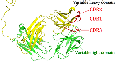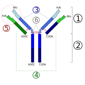3. Heavy chain (أزرق) مع واحدة متغيرة (VH) نطاق متبوع بثابتة (CH1), منطقة المفصل, و اتنين اخريين ثابتتين (CH2 and CH3) نطاقات