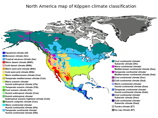 North America extends to within 10° of latitude of both the equator and the North Pole. It embraces every climatic zone, from tropical rain forest and savanna on the lowlands of Central America to areas of permanent ice cap in central Greenland.[19] Subarctic and tundra climates prevail in north Canada and north Alaska, and desert and semiarid conditions are found in interior regions cut off by high mountains from rain-bearing westerly winds.[12] However, most of the continent has temperate climates very favorable to settlement and agriculture. Prairies, or vast grasslands cover a huge amount in mountain ranges.[12]