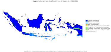 المناخ | Mostly tropical rainforest (Af), Southeastern part is predominantly tropical savanna (Aw), while some parts of Java and Sulawesi are tropical monsoon (Am) |