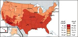 يتباين مناخ الولايات المتحدة من مكان لآخر تباينًا كبيرًا؛ فالمدى السنوي للحرارة يتـراوح بين 13°م في بارو بألاسكا و25,7°م في وادي الموت بولاية كاليفورنيا. وقـد سجلت أعلى درجــة حــرارة تسجل على الإطلاق في وادي المـوت بتـاريخ العـاشر من يونيـو عــام 1913م؛ حيث بلغت في ذلـك اليــوم 57°م، كما سجلت أقــل درجة حـرارة وهي -62°م قـرب مدينـة بـارو بألاسكا بتاريخ 23 يوليو 1971م.