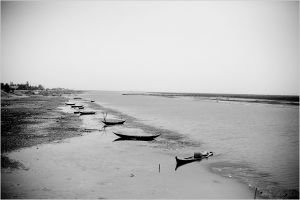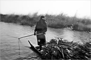 ![]() صياد في قارب صيد محلي في المياه الضحلة لنهر الفرات تحت جسر الهندية. |