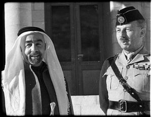 غلوب باشا والأمير عبد الله، 1940-1946. فضل الصورة: فرانك هرلي، مجموعة نگاتڤ هرلي، مكتبة أستراليا الوطنية، الصورة FH/5886.[2]