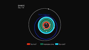 On May 25, a new orbital solution was released by the initial discovery team, with five confirmed planets and two unconfirmed. Of the five, three planets, Gliese 667 Cc, Cf, and Ce, are located in the habitable zone of the host star. Gliese 667 Cf has an orbital period of about 39 days, while Gliese 667 Ce has a longer period of roughly 62 days. Gliese 667 has the most known low-mass planets in its habitable zone of any star,[14] and for that reason the system is extremely dense. Preliminary analysis indicates that the planets cannot have more than twice their minimum masses in order for the system's orbits to be stable, constraining the orbital inclinations[7] of the planets above 30 degrees.