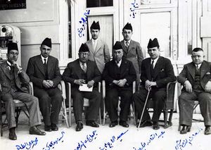 ![]() الجالسين من اليمين إلى اليسار: الوطني الفلسطيني إسعاف النشاشيبي – عبد القادر الكيلاني – الوطني العراقي سعيد الحاج ثابت – رئيس الوزراء العراقي جميل المدفعي – الوزير العراقي مهدي كبة – محمد علي الطاهر. واقفين من اليمن إلى اليسار: سليم ثابت – خالد الشوربجي. أخذت الصورة في القاهرة في الأربعينات. |