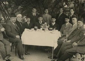 ![]() حفل أقامه محمد علي الطاهر في جزيرة الشاي بحدائق الحيوان في القاهرة عام ١٩٣٩؟ تكريما للوفد العراقي المتوجه إلى اليمن. من اليمين إلى اليسار: من المحتمل أن يكون بشير السعداوي من ليبيا – الوطني العراقي سعيد الحاج ثابت – الوزير مهدي كبه – عبد القادر الكيلاني – الفريق عزيز علي المصري باشا ، وزير الحربية المصري الأسبق – خالد الشوربجي – شيخ غير معروف الإسم – رئيس وزراء العراق جميل المدفعي – محمد علي الطاهر واقفا وإلى يمينه سليم ثابت. مدعوين آخرين ولكن غير ظاهرين في الصورة : عبد الله رشيد – محمد كامل القصاب – عبد العزيز الحلبي - أسعد داغر. |